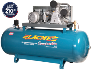Compresseur professionnel fixe, à entrainement par courroie, groupe fonte tricylindre en W biétagé : 42 m³/h, triphasé 400 volts - 7,5 CV / 5,5 kW, sur cuve grande capacité 500 litres - 12 bar maxi,