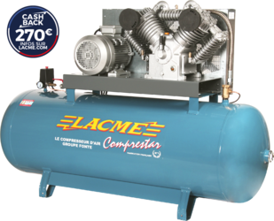 Compresseur professionnel fixe, à entrainement par courroie, Haute pression, groupe fonte double bicylindre en V, biétagé gros débit : 60 m³/h, Triphasé : 400 volts, Moteur 1500 tr/mn - 13 CV / 7,5 kW, sur cuve grande capacité 500 litres - 14 bar maxi.