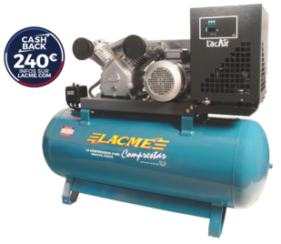 Compresseur professionnel fixe spécial atelier, à entrainement par courroie, groupe fonte bicylindre en V, monoétagé gros débit : 40 m³/h, triphasé 400 volts - 7.5 CV/5.5 kW, grande capacité : cuve 270 litres - 10 bar maxi, avec sécheur frigorifique indépendant : point de rosé 3°C