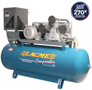 Compresseur professionnel, fixe spécial atelier, à entrainement par courroie, série endurance, groupe fonte tricylindre en W, monoétagé gros débit : 55 m³/h, triphasé 400 volts - 10 CV/7,5 kW, grande capacité sur cuve 500 litres - 11 bar maxi, avec sécheur frigorifique : point de rosé 3°C