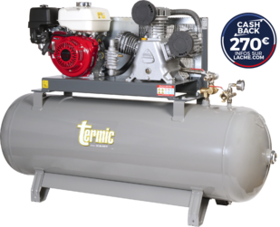 Compresseur fixe thermique, groupe fonte tricylindre en W, gros débit biétagé : 39 m³/h, moteur HONDA GX 270 (270 cm³ - 8,4 CV), cuve 300 litres - 12 bar maxi. Équipement standard, soupape de régulation, robinet de sortie gros débit.