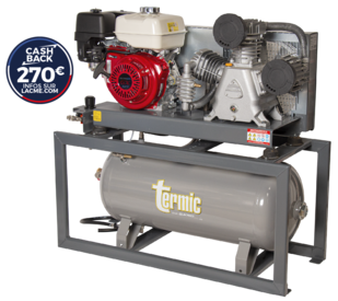 Compresseur thermique, embarqué (stationnaire), autonome, spécial chantier, moteur essence HONDA, groupe fonte tricylindre en W biétagé gros débit : 45 m³/h, cuve 90 litres - 15 bar pour plus d'autonomie. Châssis tubulaire pour meilleure protection et faciliter son chargement. Équipement complet : tableau de bord avec filtre régulateur gros débit, sortie directe raccord rapide.