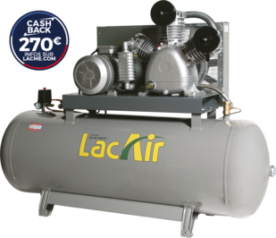 Compresseur professionnel fixe, à entrainement par courroie, haute pression, groupe fonte tricylindre en W biétagé, gros débit : 60 m³/h, triphasé 400 Volts, moteur 1500 tr/mn - 13 CV / 10 kW, sur cuve grande capacité 500 litres - 14 bar maxi Équipement : cuve avec longerons, contacteur manométrique, boîtier de commande avec protection thermique, compteur horaire, sortie directe raccord rapide, robinet de sortie 3/4"F