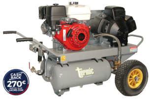 Compresseur thermique, groupe fonte tricylindre en W caréné et turbo ventilé : 40 m³/h, moteur HONDA GX 270 (270 cm³ - 8,4 CV), cuve 2 x 20 litres - 11 bar maxi. Équipement complet : châssis type brouette avec grosses roues gonflables, soupape de régulation, tableau de bord avec filtre régulateur avec sortie raccord raide, robinet de sortie directe.