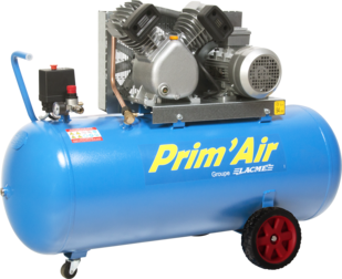 Compresseur professionnel mobile, à entrainement par courroie, groupe fonte bicylindre en V, lubrifié : 25 m³/h, triphasé 400 volts - 3 CV/2.2 kW, sur cuve 150 litres - 10 bar maxi. Equipement complet, dont : poignée haute, grosses roues, roue directrice, contacteur-disjoncteur, détendeur avec sortie raccord rapide.