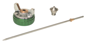 1 buse en inox, 1 aiguille inox et 1 chapeau de buse en laiton anodisé avec bague de serrage intégrée
