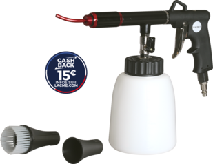 Pistolet pour le nettoyage professionnel des tissus, garnitures, canaux d'aération, tapis... Technologie de nettoyage à rotation cyclonique, apportant un gain de temps grâce au tourbillon généré par la rotation de la buse en aluminium. Adapté pour les endroits difficiles d'accès comme les coutures ou entre les sièges. Les saletés se dissolvent facilement grâce à la pulvérisation très fine des produits de nettoyage, dégraissant, lustrant...