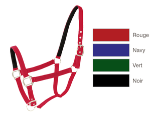 En polypropylène double épaisseur Bouclerie acier chromé Oeilletons de renfort Double réglages muserolle et têtière